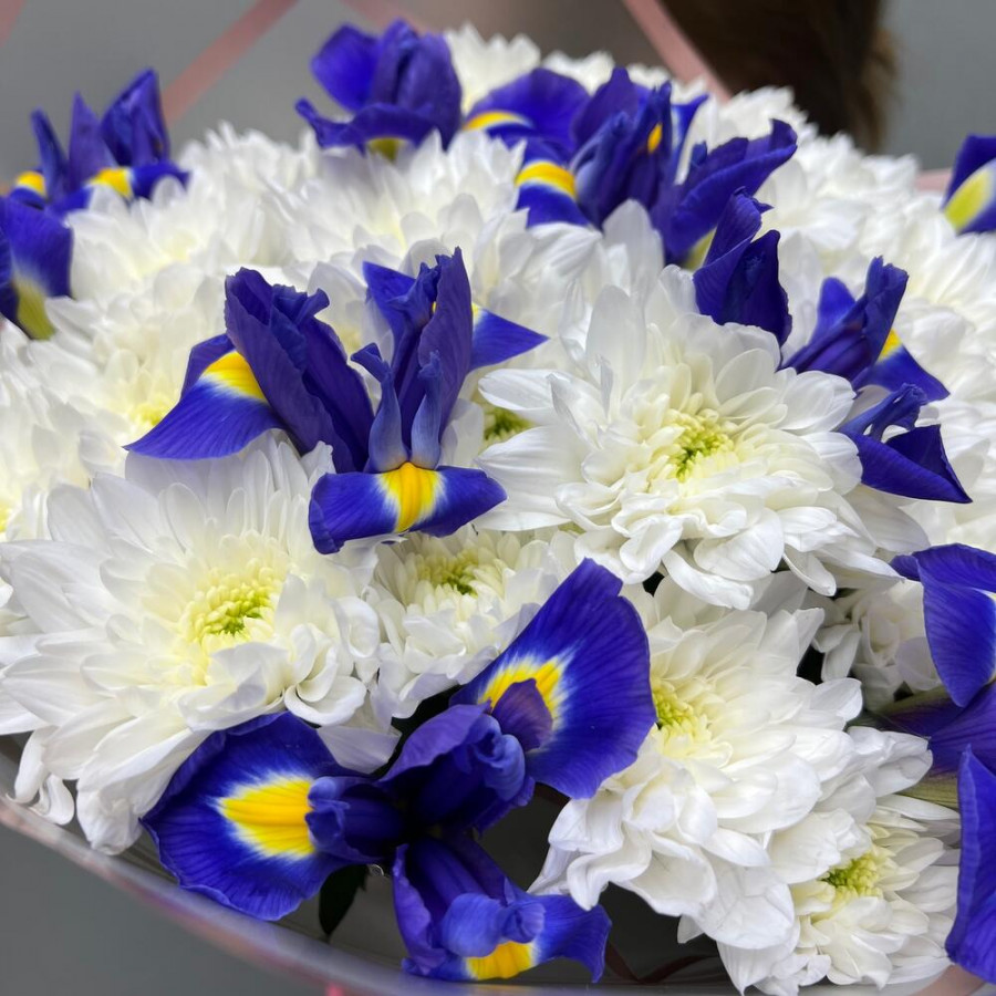 На фото букет «снежная сказка». В составе: ирис 10 шт, хризантема кустовая 5 шт, дизайнерская упаковка 1 шт, атласная лента 1 шт, . Все цветы свежие и ароматные, букет красиво оформлен и отлично подходит для подарка. Доступна доставка цветов или самовывоз.